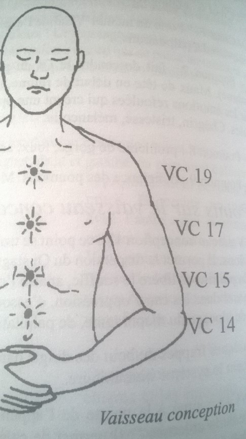 Vaisseau Conception 17 (VC17) : à masser du bout du bout des doigts en tournant, en cas d’oppression, de blocage du diaphragme, de palpitations, d’angoisse et de nervosité