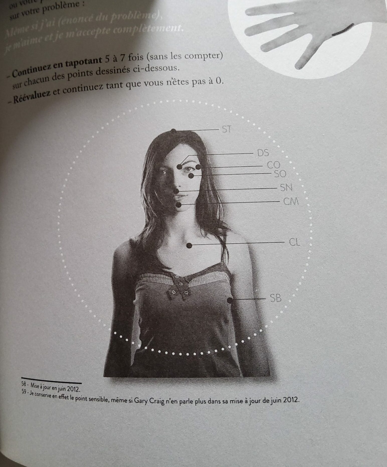 Commencez la séquence de tapotements en tapotant 5 à 7 fois sur chacun des points d’acupuncture suivants en disant le mot ou la phrase de rappel. Ex. “cette peur” ou “ces crampes dans le ventre”, à actualiser en fonction de l’évolution des ressentis