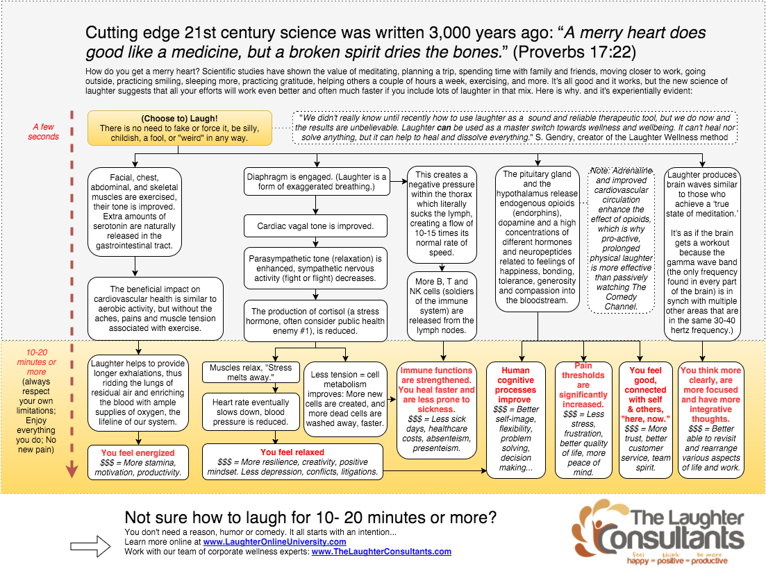 Pour conclure, le rire génère un mouvement interne, une pulsation de vie qui s’exprime à l’extérieur (par vos actions, vos sourires) et qui par conséquent modifie votre environnement immédiat professionnel et personnel.